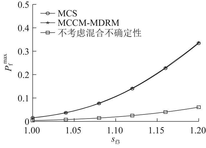 图5 所示为不同安全系数s f1 下行星轮齿面接触疲劳最大失效概率的变化曲线。图中“不考虑混合不确定性”表示仅将区间变量变为概率变量(不改变参数取值,只改变其分布形式)的情况。从图5 中可以看出,当不考虑概率-区间混合不确定性时,行星轮齿面接触疲劳最大失效概率的预测结果偏小,导致可靠性评估结果存在偏差;当考虑混合不确定性时,本文所提出的方法(MCCM-MDRM)与MCS方法的计算结果吻合良好,验证了本文方法的准确性。