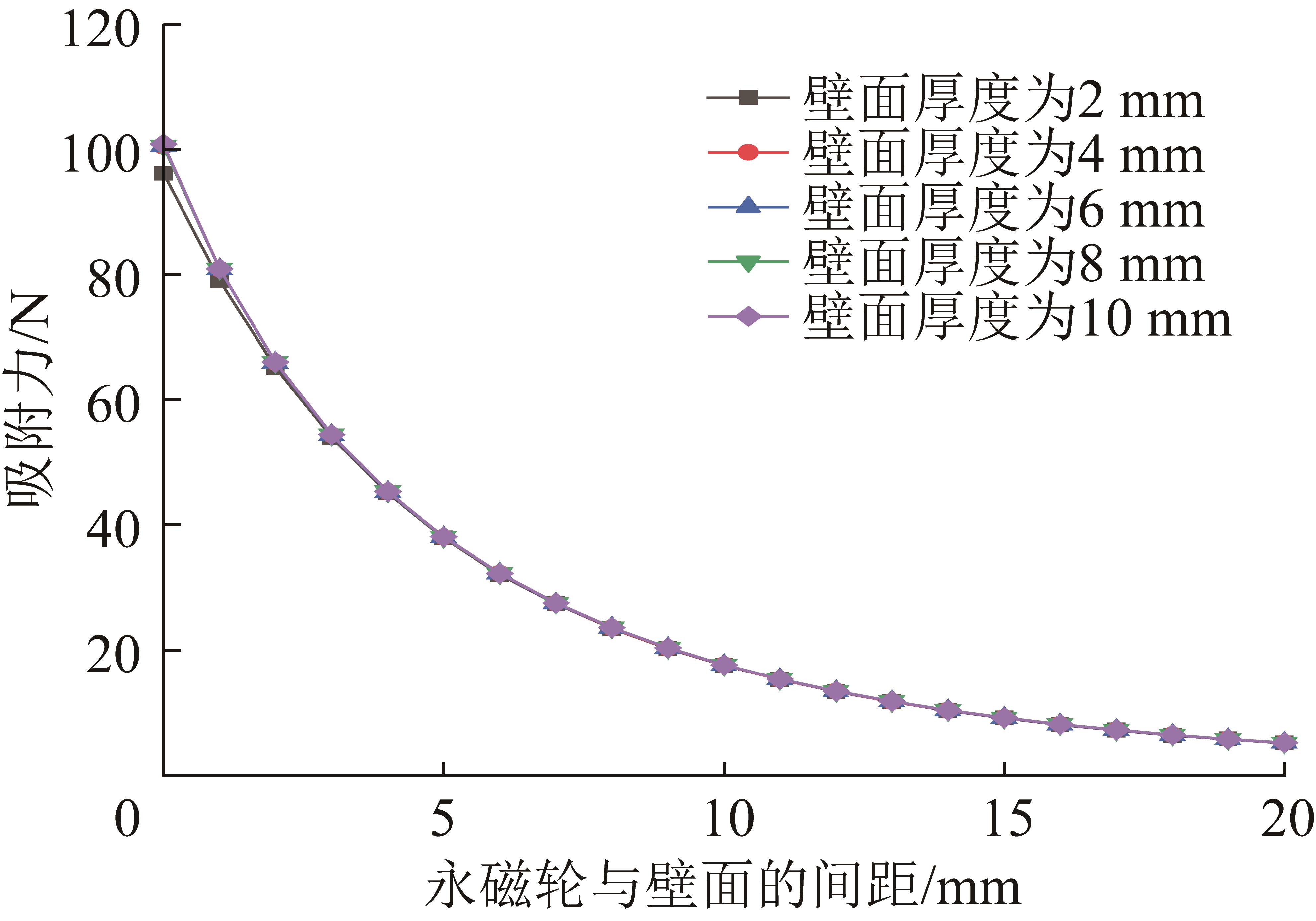 | 图5 单侧Halbach永磁轮的吸附力与壁面厚度、壁面间距的关系 |