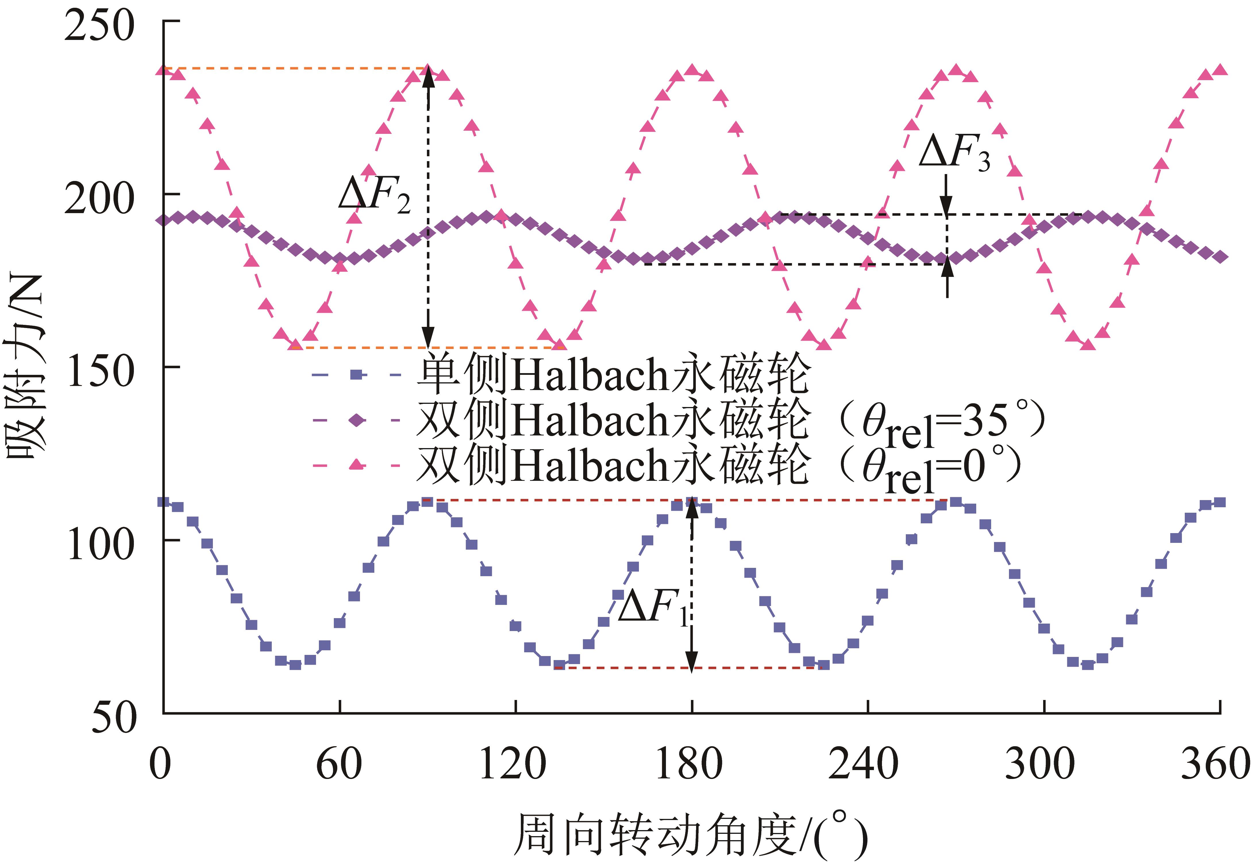 | 图9 Halbach永磁轮周向转动过程中的吸附力变化曲线 |