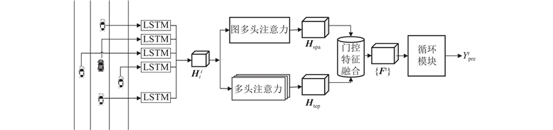 为了处理车辆轨迹预测中各辆车交互影响的差异性,近年来注意力机制被广泛使用[15-22],如Lin等[16]在Deo 等[11]的基础上,提出基于网格的时空注意力机制;Chen等[19]提出动态时空注意力网络架构,通过分层捕捉时间和社会关系表示车辆之间的动态变化. 然而,这些注意力机制模型无法有效处理预测轨迹的多模态特性,导致预测的轨迹与真实的轨迹相差较大[23]. 为此,有研究者将Transformer模型[24]中的多头注意力(multi-head attention, MHA)运用于车辆轨迹预测. 例如,Messaoud等[23]在编码层和解码层之间嵌入多头注意力机制模块,能充分提取车辆之间的交互信息;Li等[1]分别从时间和空间维度设计多头注意力机制模型,并将两者串联以提取车辆轨迹的时空特征. 尽管Transformer模型提高了车辆轨迹预测的精度,但大部分模型只考虑了单维度的多模态问题,难以提取所有特征信息实现特征融合,导致轨迹预测精度提高有限.