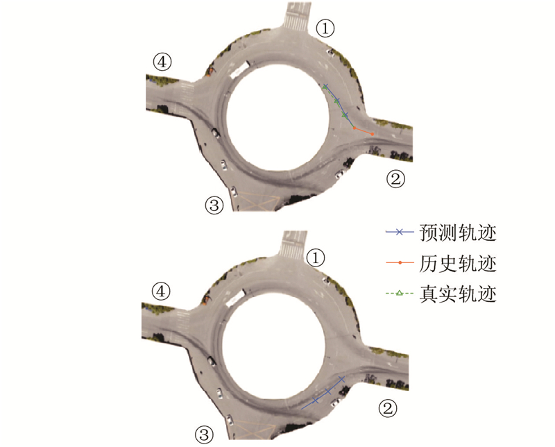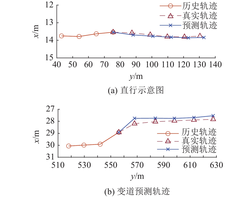 如图4(a)、(b)所示为高速公路场景下直行与变道的可视化轨迹图. 可以看出,无论是在直行还是变道,本研究提出的TSMHA均能够精确预测观测场景中目标车辆的运动轨迹.
