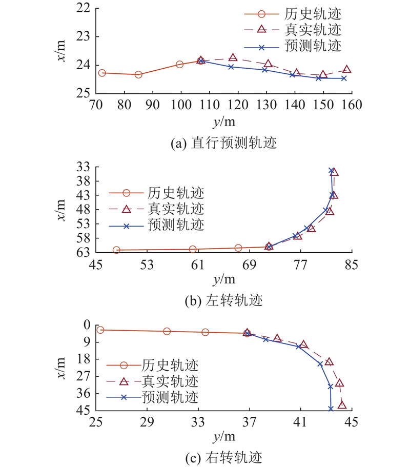 Peachtree Street和Lankershim Boulevard子数据集不仅包括十字路口转向数据段,还包括城市道路中的直行与变道情况,如图5(a)~(c)所示分别展示了车辆在城市道路中直行、左转以及右转的轨迹预测. 可以看出,整体上TSMHA能够较好地预测未来轨迹. 如图5(b)所示为车辆左转的场景,TSMHA预测的未来轨迹与真实轨迹相近. 在转向案例的结果分析过程中,会出现一部分预测轨迹不准确的情况. 例如,如图5(c)所示为车辆右转的场景,相对于真实轨迹,预测轨迹速度更快,且预测轨迹距离真实轨迹横向更远. 造成这种现象的原因,除了TSMHA本身预测的误差,可能存在着其他道路使用者干扰车辆正常行驶的情况,例如行人横穿马路.