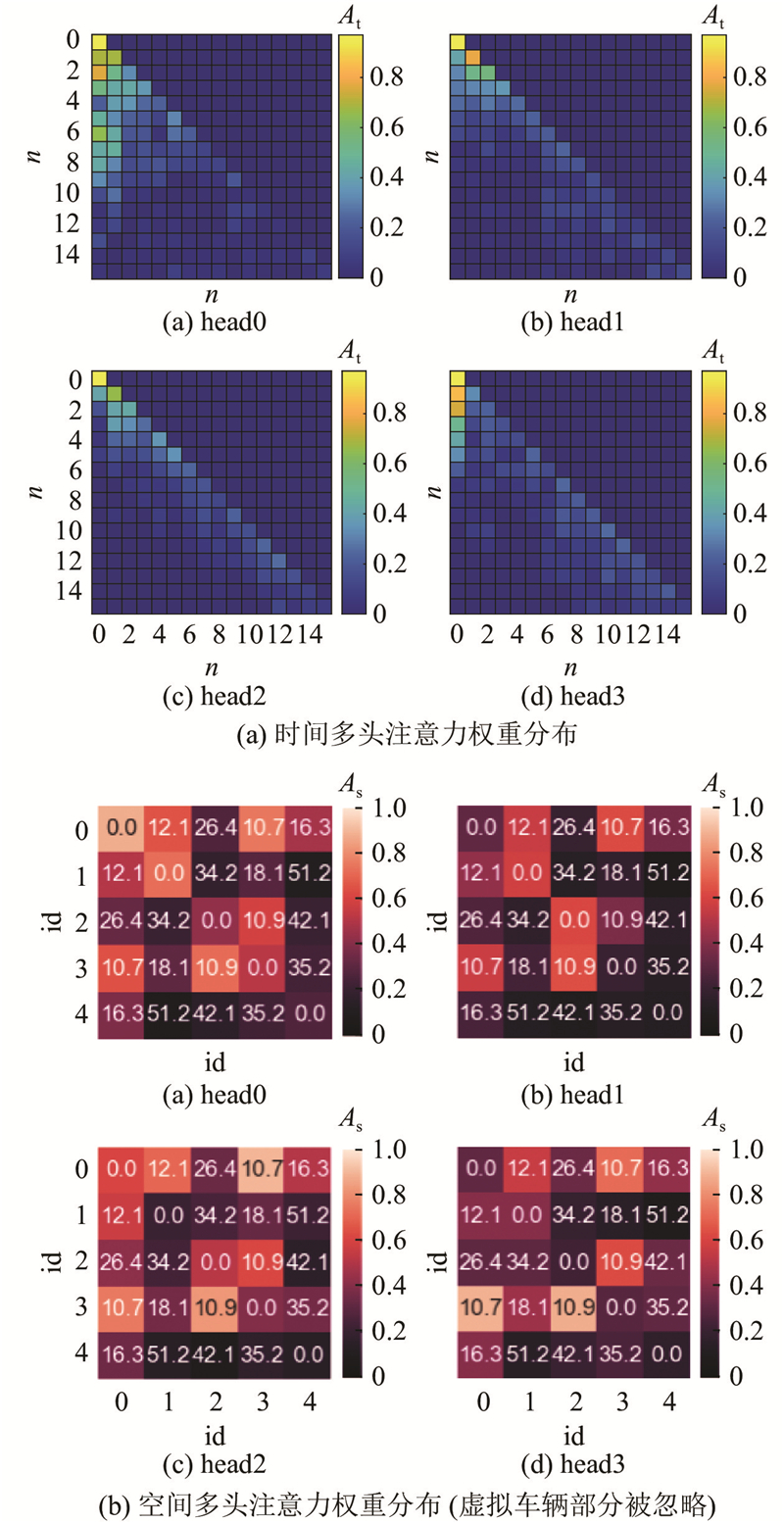 注意力权重能够反映一个元素对其他元素的重要程度. 为了进一步分析本研究所提出模型的性能,将时间注意力和空间注意力的最后一层注意力分布可视化,结果如图7(a)、(b)所示. 图中,整数n为时间步长 ,所对应的时刻为t = Tobs−0.2×n;id表示车辆编号;At、As分别为时间、空间上的归一化注意力值. 由图7(a)可以看出,距离当前时刻越近,注意力权重越大;距离当前时刻越远,注意力权重越低. 结果说明,未来轨迹取决于当前时刻与过去一段时间内的行驶轨迹. 由图7(b)可以看出,车辆之间距离越近,注意力权重越高. 上述2个结果与真实道路结果一致,说明TSMHA符合真实交通逻辑,并且能够有效地捕获车辆的时间依赖性与车辆之间在空间维度的交互.